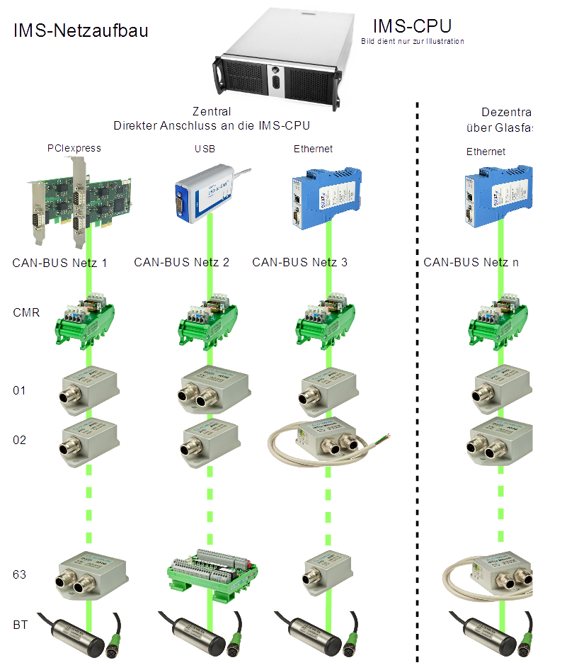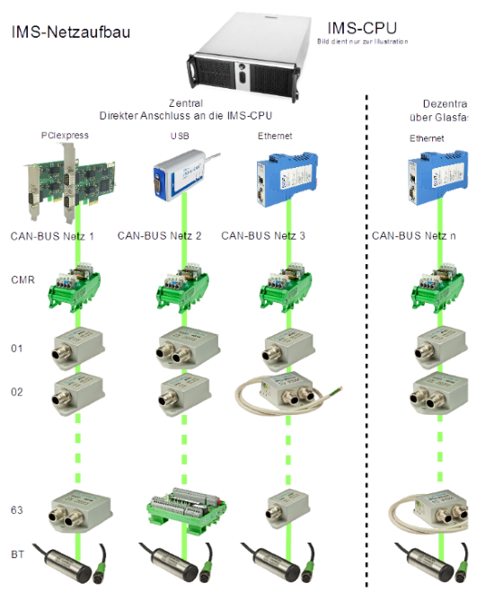 Für größere Anlagen können beliebig viele Netze an einen Auswerte-PC angeschlossen werden. Die Umsetzung auf den CAN-Bus kann durch die Interfaces IMS-LINK erfolgen. Dadurch besitzt das System eine noch nie da gewesene Freiheit in Bezug auf die topografische Anordnung der Komponenten.
